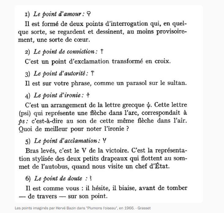 Après cette longue maturation, entre signes nouveaux (les parenthèse, les ?,!, "") signes disparus ( ou renommés comme le point crochu devenu virgule, le tiret initial devenu point final, la majuscule devenue en tête, le pied de mouche des moines pour indiquer un paragraphe(¶) cf pj bleu et rouge, ou un changement de sujet etc..) le bréviaire de la ponctuation a ralenti sa croissance, bien que quelques signes nouveaux soient encore proposés (“⸮” le point d'ironie de 1841 par exemple ou les points d'Hervé Bazin en pj)