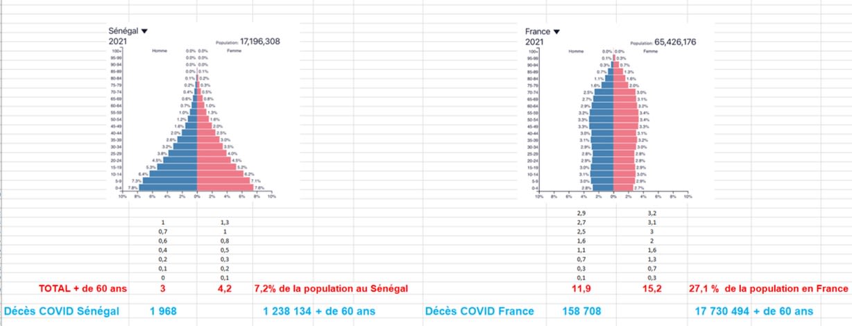 Décès COVID Sénégal 1 968 pour 1 238 134 + de 60 ans / Décès COVID France 158 708 pour 17 730 494 + de 60 ans