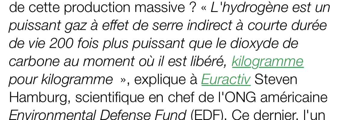 Faudrait colmater les fuites avec du schpountz. Une molécule d’hydrogène c’ est beaucoup plus petit que du méthane. Ça fuit à tous les niveaux : camion , pipelines . Voir même lors de sa fabrication par électrolyse il y en a 9% qui se barre par purge. Quand vous transportez de l’hydrogène liquide par camion citerne , il y en a 13% qui se barre. Rien que son stockage dans des réservoirs il y a à nouveau 6% de perte.