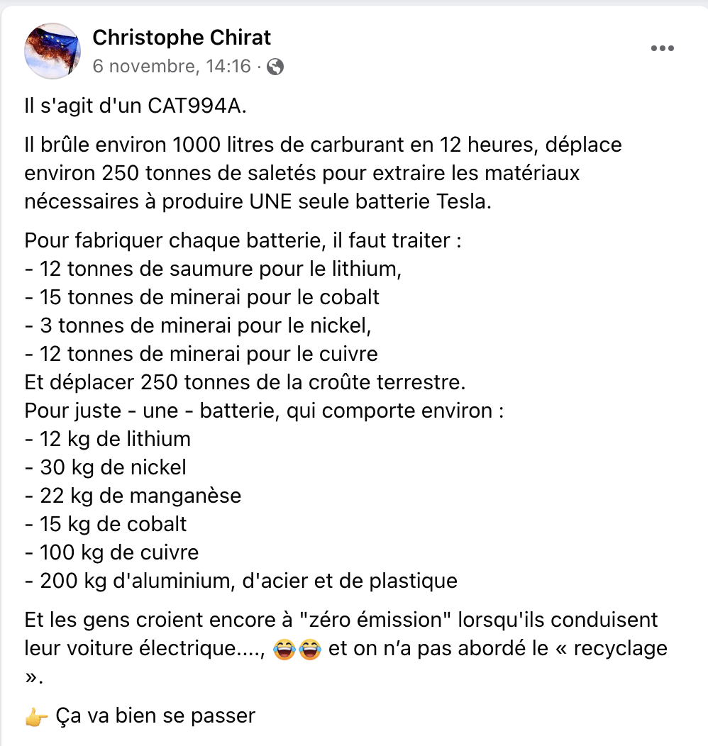 Par ailleurs, la disponibilité des minerais sur Terre fait que tu ne remplaceras pas tout le parc automobile mondial par de l'électrique, c'est juste pas possible.