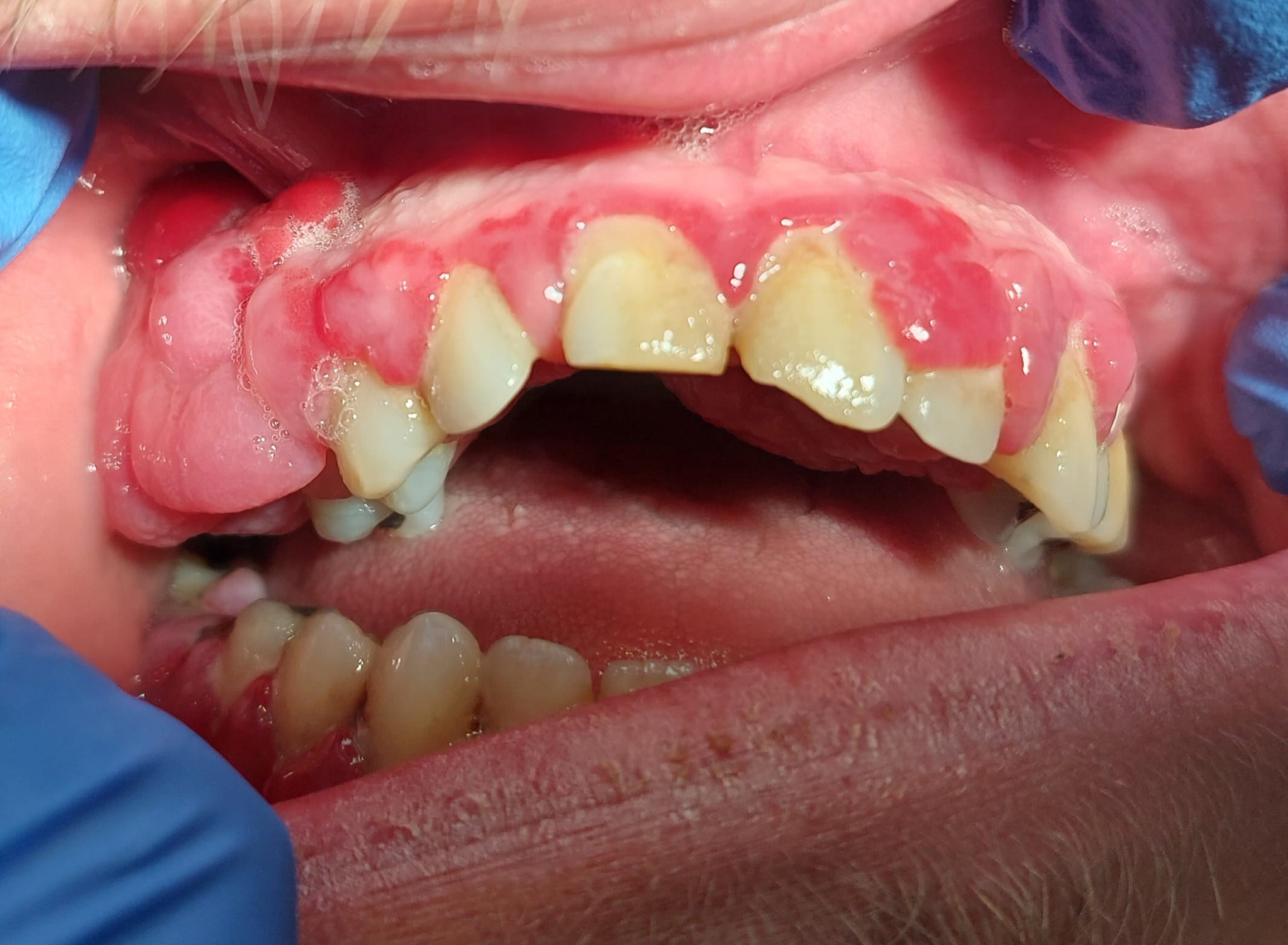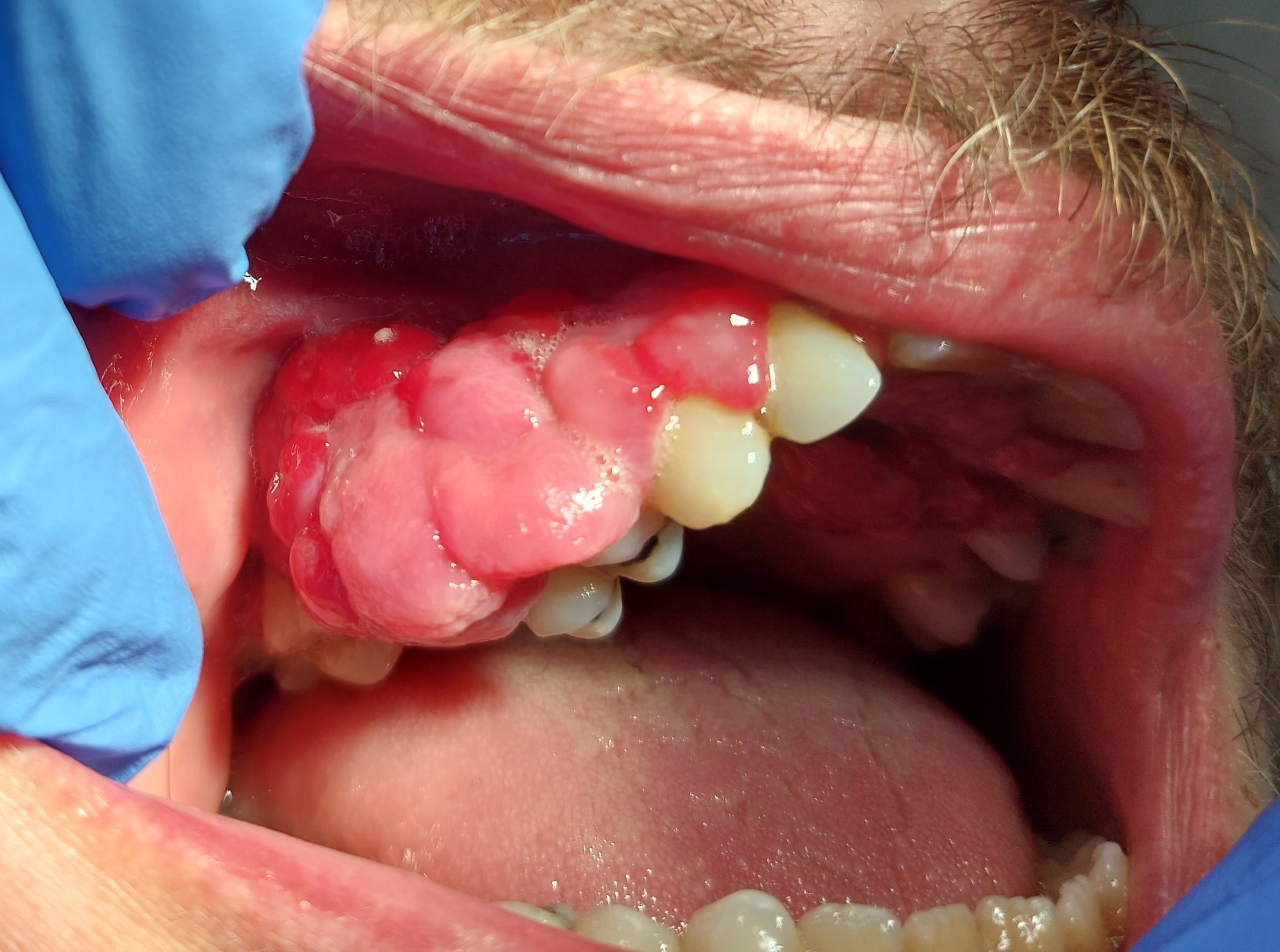 Consulte pour hyperplasie gingivale apparue progressivement en 5 mois (RAS avant d'après lui), totalement indolores, pas de saignement sauf en insistant aux collets en gingivite.