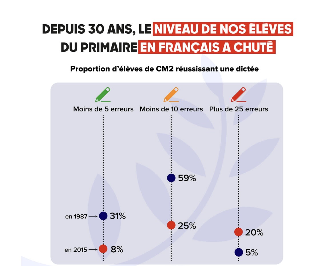 il a malheureusement totalement raison. Ils se sont amusés à faire chaque année une même dictée à des élèves de CM2. En 34 ans le nombre d'erreurs a doublé.