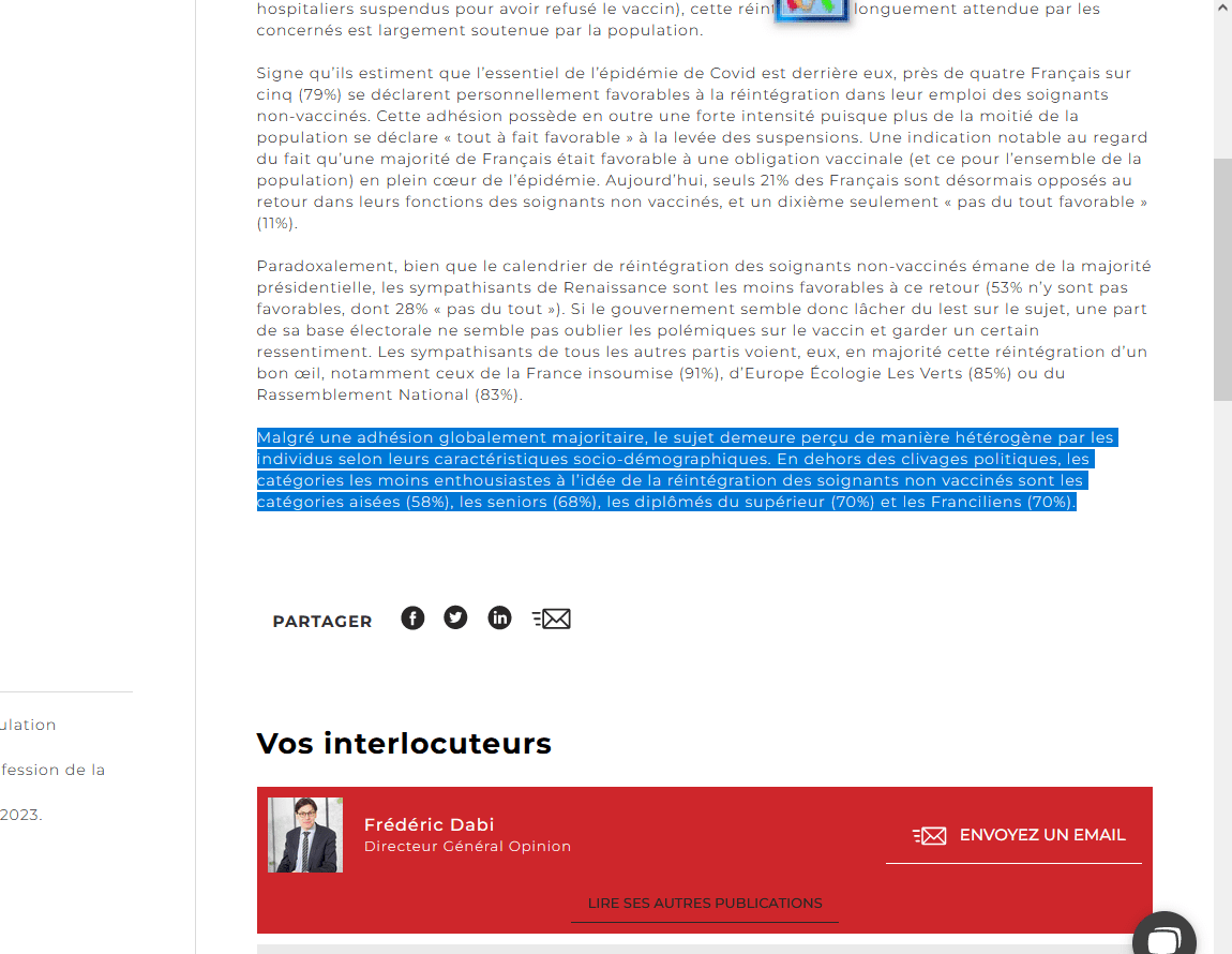 je cite : "Malgré une adhésion globalement majoritaire, le sujet demeure perçu de manière hétérogène par les individus selon leurs caractéristiques socio-démographiques. En dehors des clivages politiques, les catégories les moins enthousiastes à l’idée de la réintégration des soignants non vaccinés sont les catégories aisées (58%), les seniors (68%), les diplômés du supérieur (70%) et les Franciliens (70%)."