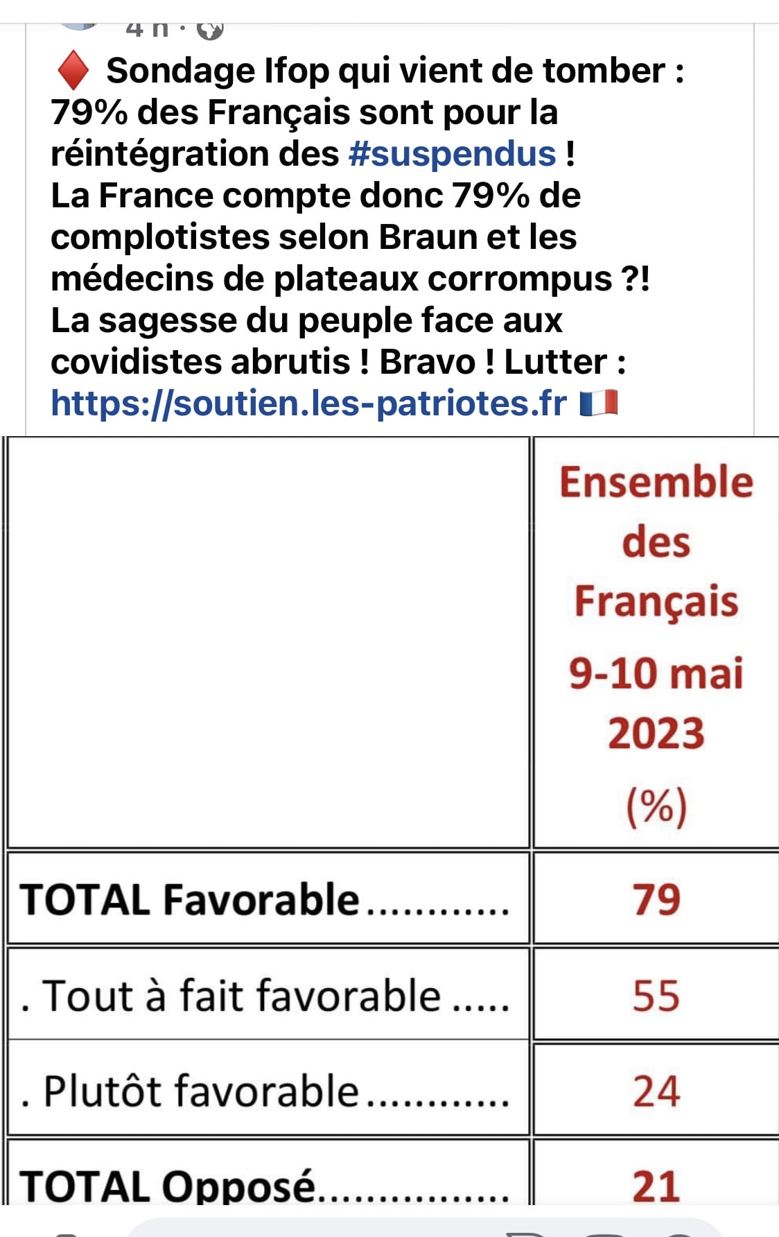 2) tu compares un avis de population générale avec un avis de représentants de medicaux. Tu as le % de soignants favorables à la réintégration qui serait necessaire pour voir si l'avis de leurs représentants y correspond ? Non. Donc tu ne peux pas faire ta conclusion.