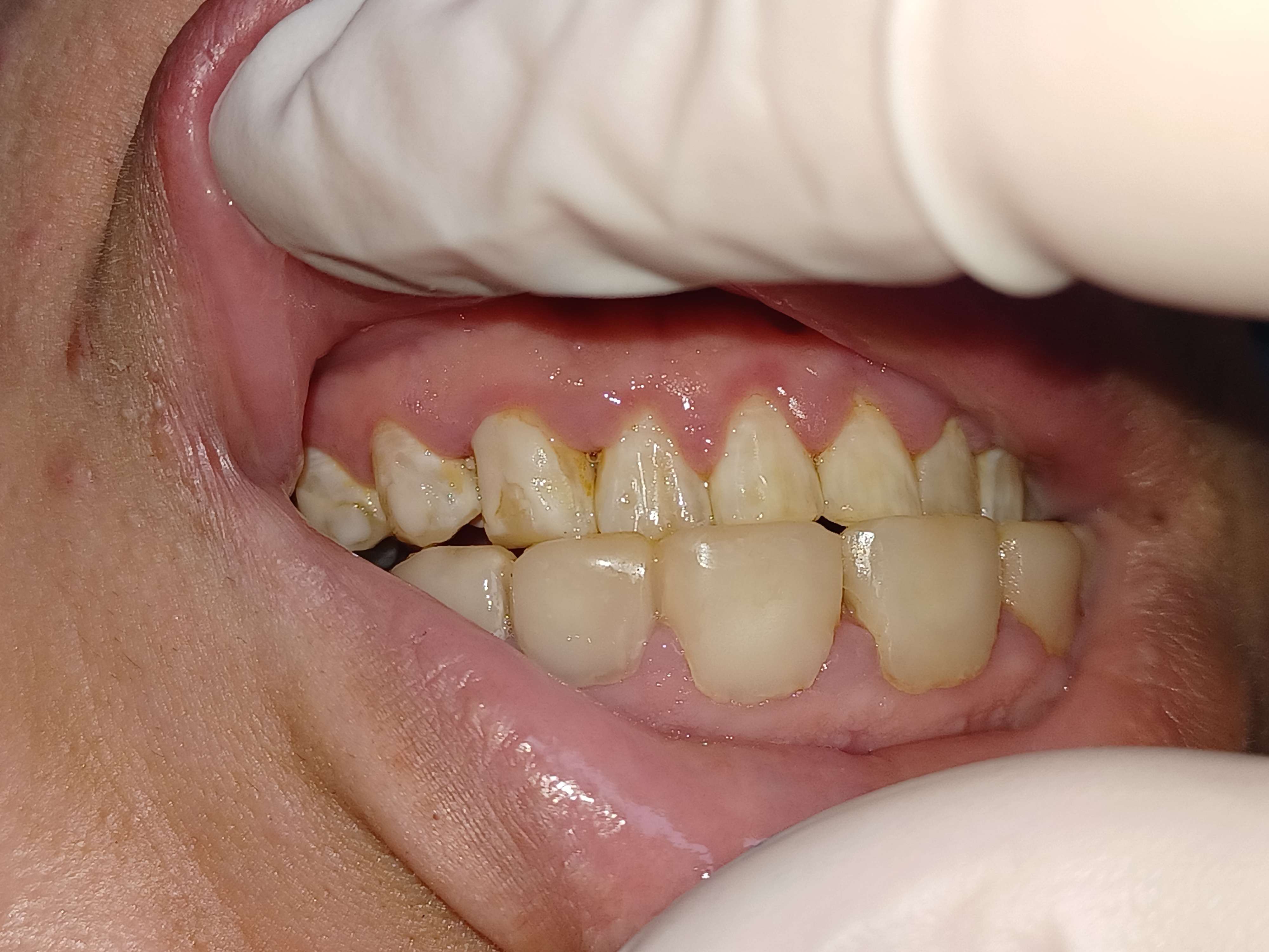 A la mandibule effectivement il y a un soucis, je n'ai pas la patiente sous les yeux pour passer en coup de sonde en interdentaire et dans le sulcus voir si de la plaque ressort, mais en visuel sur les photos il n'y a rien.