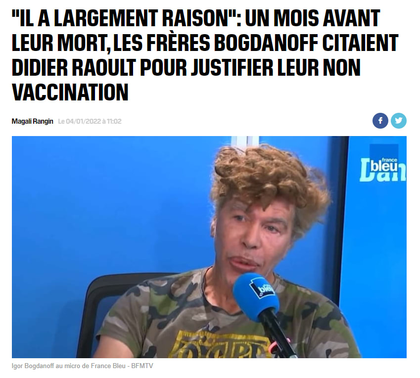 raoult a détourné des personnes a risque de la vaccination.... comme les bogdanoff et ils en sont mort... faut pas deconner c est juste anormal pour un médecin.