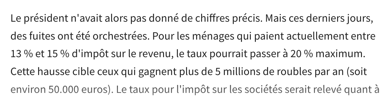 Donc nous avons des hommes politiques qui nous assomment d'impôts sans qu'on puisse se rendre compte à quoi ils servent vu la déliquescence du service public et qui t'expliquent que la Russie à 20 % d'impôts sur la moitié qui est déclarée est un système mafieux. https://www.lesechos.fr/monde/europe/le-kremlin-va-augmenter-les-impots-pour-financer-la-guerre-2082710. https://www.youtube.com/shorts/humSUajs8uE?feature=share
