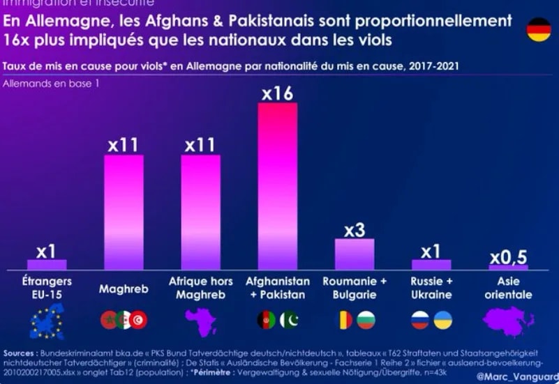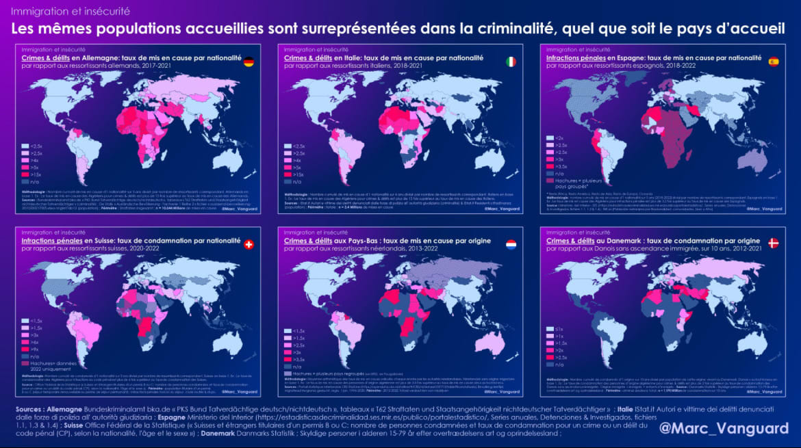On ne peut pas noyer le poisson, ca ne fonctionne pas. Tu as vu comme moi que criminalité Afghanistan + plus un autre en stan , c'est 16 fois l'ensemble UE qui est sur une base de 1, afrique sub saharienne, 11 fois, afrique du nord 11fois. et Asie 0.5 (reglent ca entre eux, tres discretement!). Chiffres impitoyables.