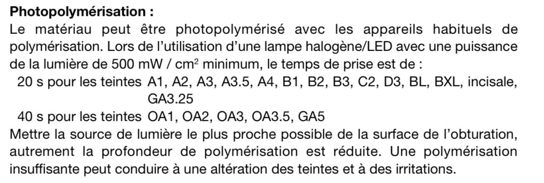 Et dans la rubrique photopolymerisation. Il n’y est pas fait mention de polymérisation à chaud.