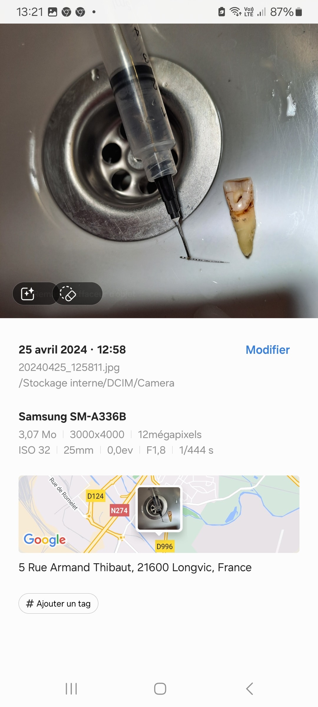 J extrais la dent , une fois dehors je dévisse la lime et la ressors . Je finis l endo et je remets la dent .
