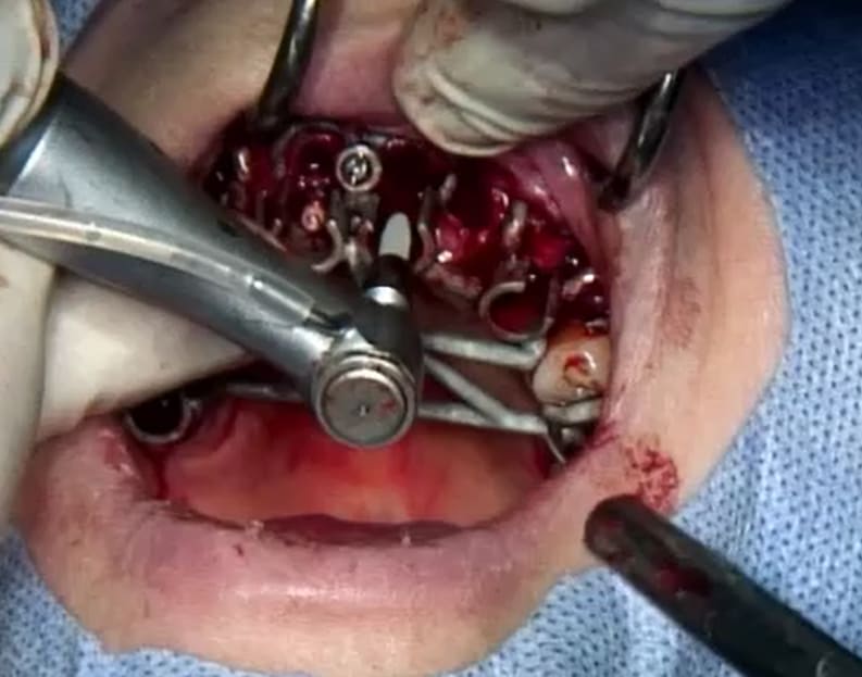 -En haut des implants posés sur une canine incluse qui n’ont tenu que quelques temps. La canine incluse est toujours bien là et s’étend en dessous des sites 22/23/24/25