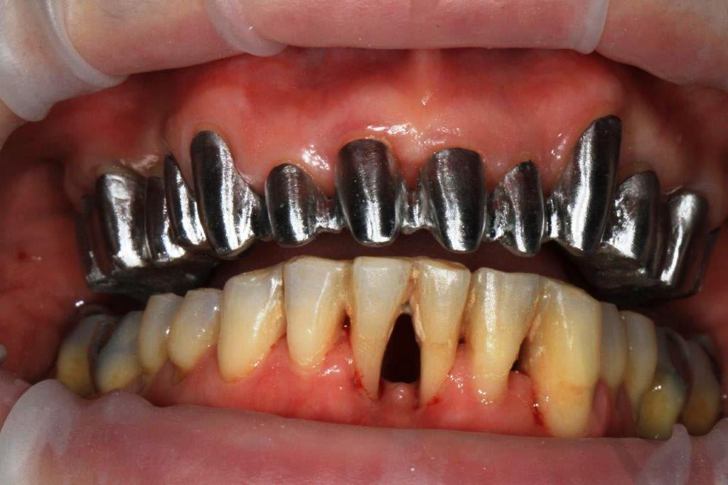 je suppose que l'armature à l'essayage (photos 1 et 2) peut faire penser à une armature de céramométallique, mais ce n'est pas le cas, il s'agit uniquement d'une armature "attelle" de contention, et les ceamoceram (Emax press) sont scellées dessus l'ensemble métal/dents, ce qui permet une finition plus esthétique, mais surtout biologiquement plus sympa pour le parodonte.