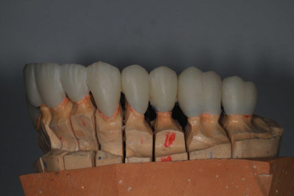 je suppose que l'armature à l'essayage (photos 1 et 2) peut faire penser à une armature de céramométallique, mais ce n'est pas le cas, il s'agit uniquement d'une armature "attelle" de contention, et les ceamoceram (Emax press) sont scellées dessus l'ensemble métal/dents, ce qui permet une finition plus esthétique, mais surtout biologiquement plus sympa pour le parodonte.