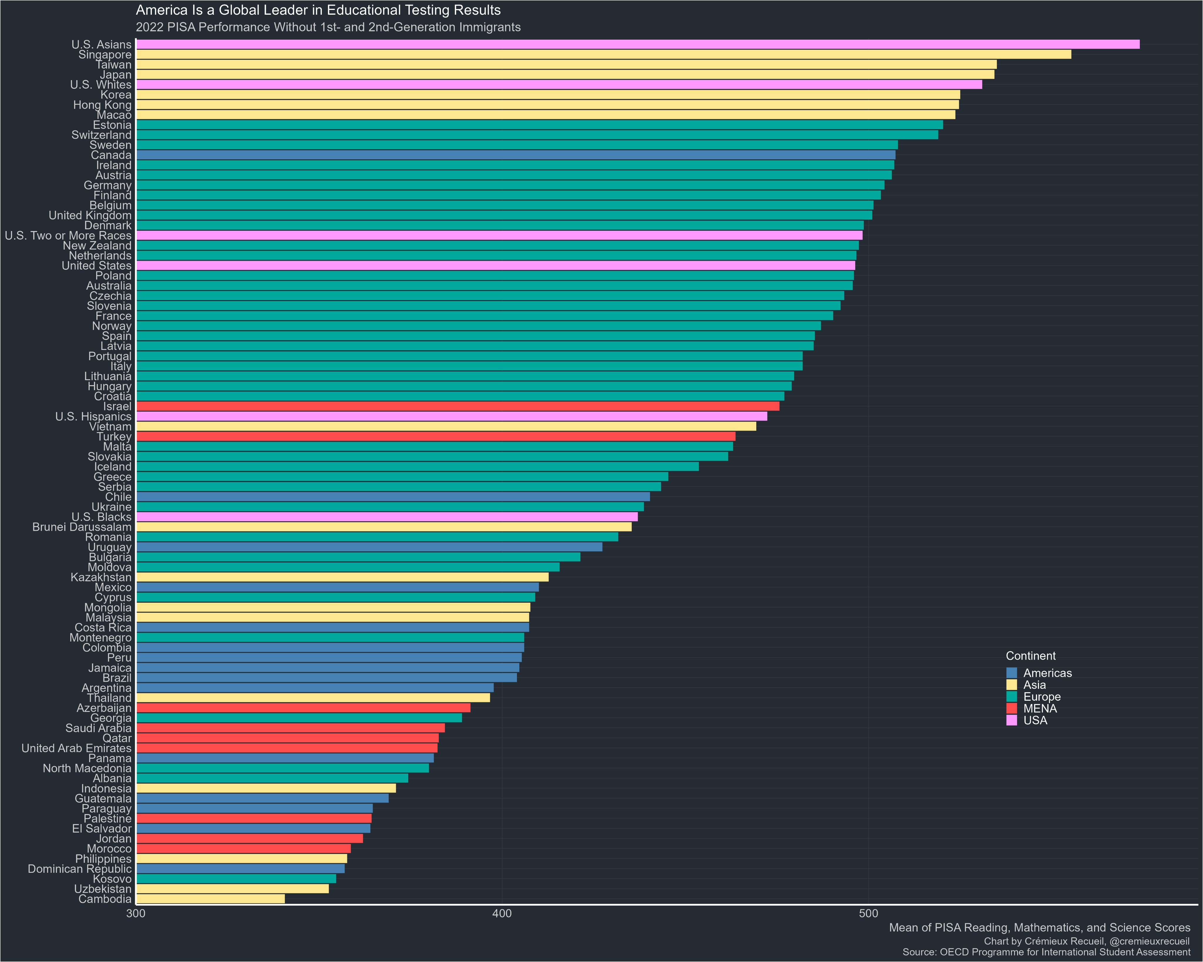 Classement PISA 2022 par origine géographique et pour les USA par ethnie