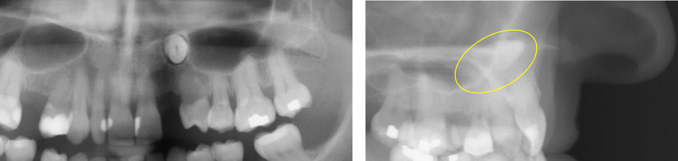 Sur la même pano, de l’autre côté, l’incluse a été extraite et le site finira peut être avec un implant si la 12 se fait la malle… pourquoi ne pas l’avoir laissée en place tant que la situation était stable?