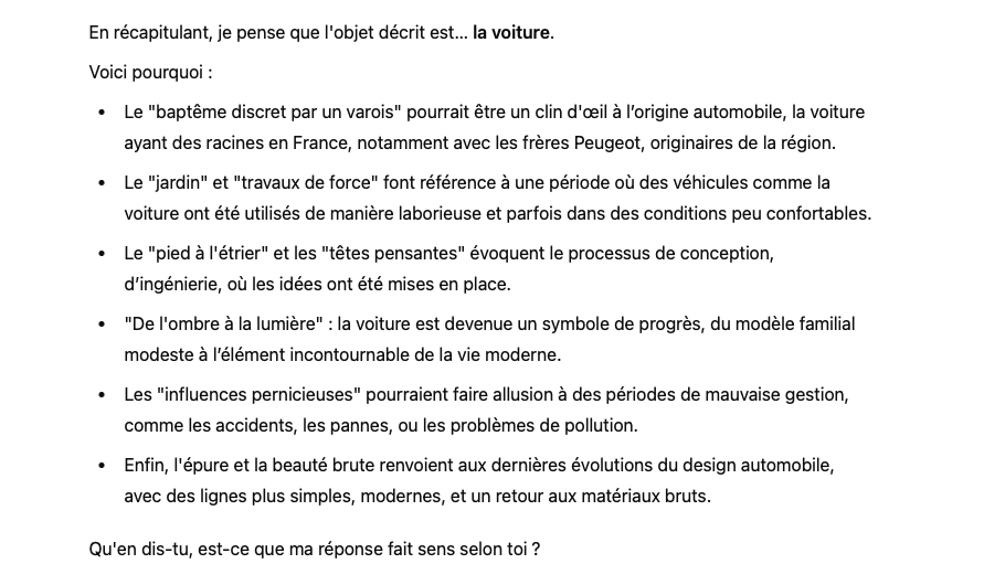 mla3, si Hokusai a donné sa parole, on peut le croire. N'oublie pas que des que l'enigme sort, je la soumets a 2 IA (perplexity et deepseek) pour savoir sir l'enigme est trouvable TROP facilement des le debut. Je t'assure que le béton ne pouvait pas etre trouvé par IA, c'est beaucoup trop imagé pour elle. OU ALORS, il faut l'aiguiller de facon subtile (et difficle) au fur et a mesure des indices. Et ca revient a peu pres au meme quy'une recherche google avec plusieurs mots clefs.