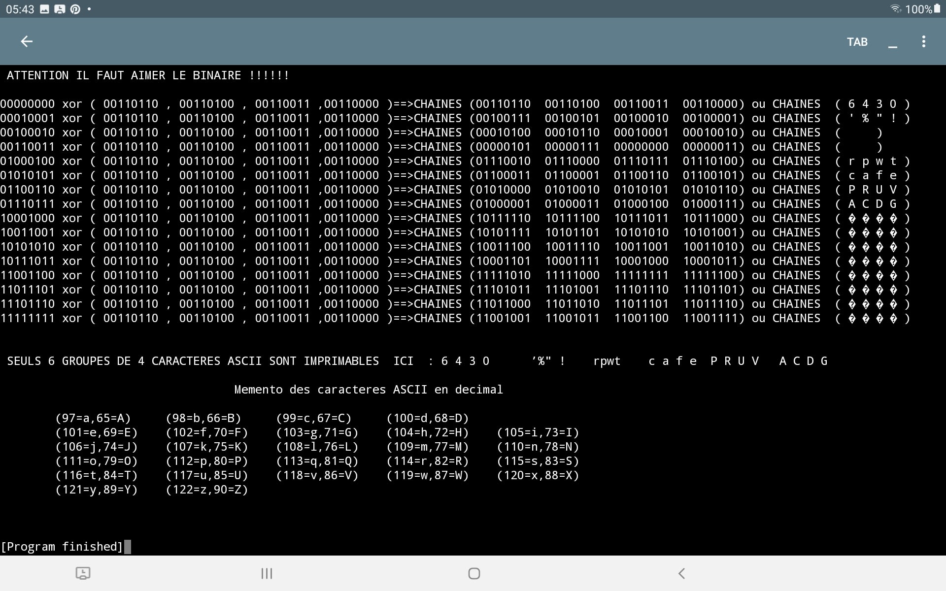 Pour moi les 15 chaînes cryptées qui conduisent à la chaîne que tu as donné à savoir ASCII 54, ASCII 52, ASCII 51, ASCII48 sont résumées dans le document joint ci dessous (avec prog en C). Ils ne sont pas tous imprimables soit parceque c’est ainsi du fait de leur nature même soit parcequ’en C ce n’est pas gerable car on tombe en ASCII ETENDU qu’on le veuille ou non.