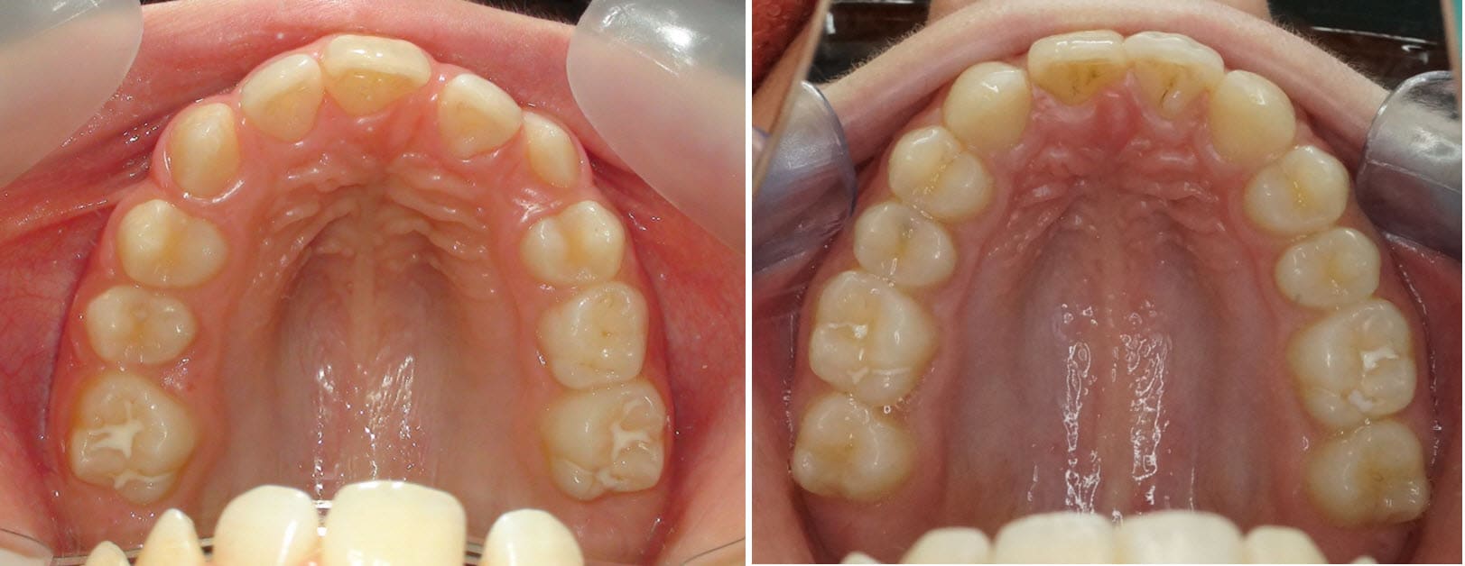 Il était souvent possible de bénéficier ensuite d’un calage par l’occlusion pour éviter une éventuelle dérive pendant leur redressement radiculaire qui pouvait alors être réalisé sans difficulté à l’aide des accessoires préfabriqués.