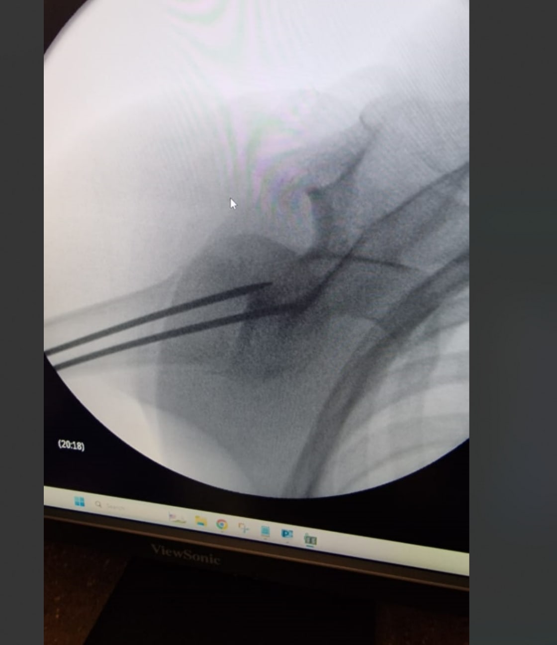 Incision de 2.5 cm pour remettre en place la tête d'humerus fracturée et déplacée, suture nickel. chapeau.