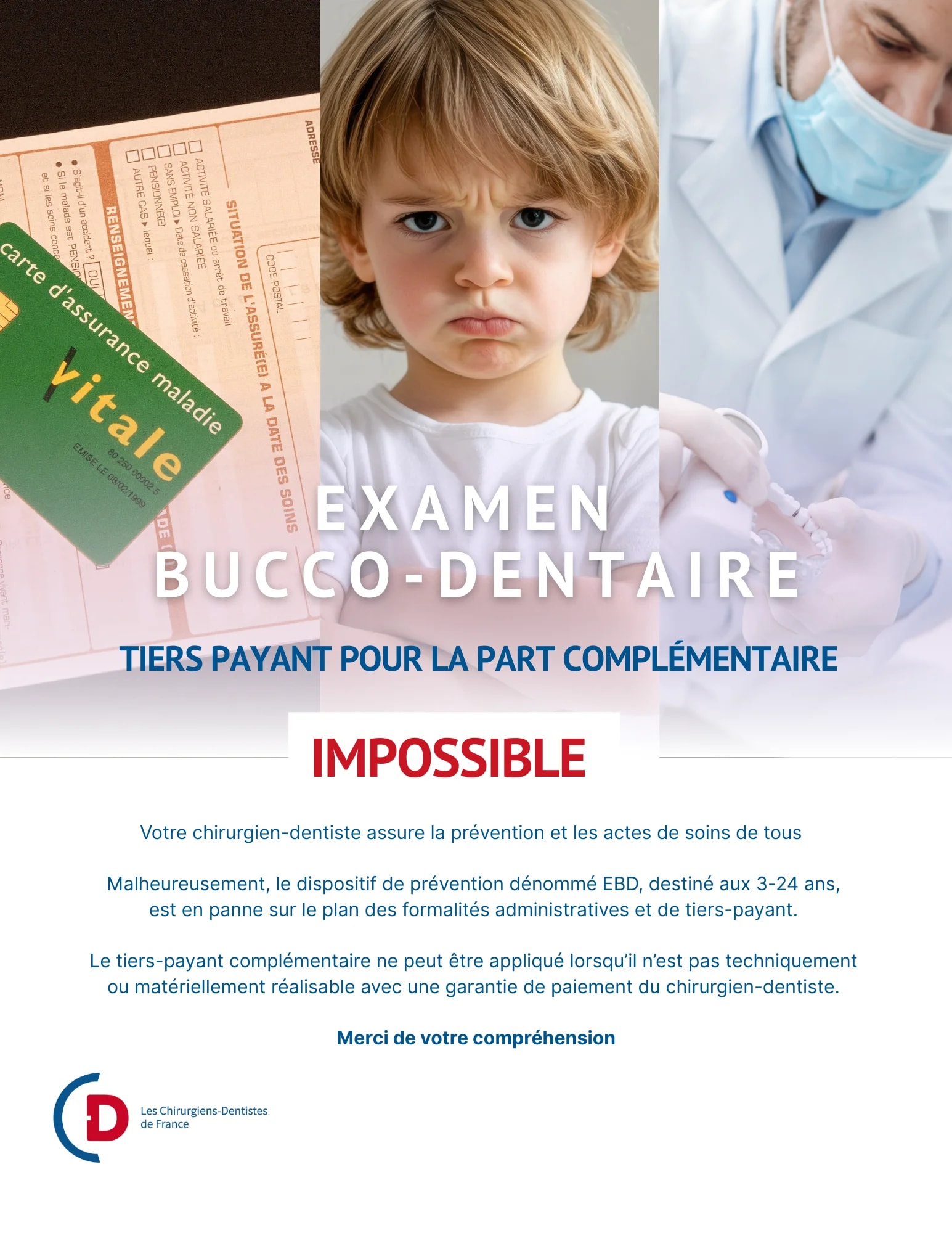 Les Chirurgiens-dentistes de France, réunis en Conseil d’administration confédéral le 29 mars 2025, demandent la suspension du double tiers payant pour l’EBD 2.0 et les soins associés, et exigent la mise en place d’un tiers payeur unique pour sauver la prévention bucco-dentaire.