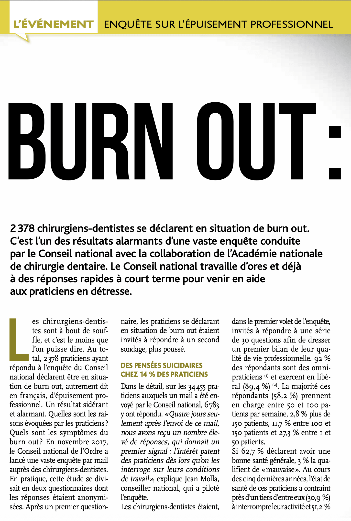 Même si ce qu'a énoncé bouboule n'est pas forcément la réponse idéale au problème du burn-out , la réponse que tu lui fais, montre le peu de considération que tu portes au sujet de l'épuisement professionnel dans le dentaire en France, et le peu d'empathie pour tes confrères qui en souffrent. Et le fait de bien gagner sa vie n'enlève rien à la souffrance. Tant mieux pour toi, si tu t'épanouis dans l'environnement professionnel actuel, mais aie un minimum de respect pour ceux qui sont victimes de cette souffrance professionnelle, dont il est difficile de sortir tant notre diplôme hyperspécialisé limite les reconversions.