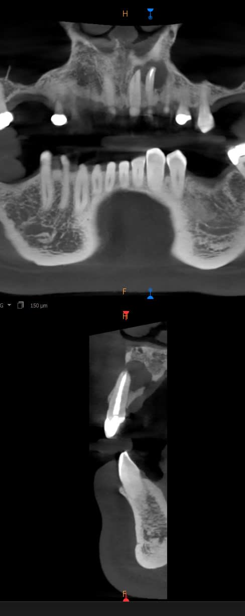 Par contre elle peut être conservée provisoirement avec une résection sévère (au moins moitié de la racine) dans le cadre d'un curetage+comblement, pour essayer d'éviter un greffe ultérieure compliquée, qui sera inévitable si extraction d'emblée. En effet, si extraction en l'état la corticale vestibulaire ne tiendra pas le choc, et peut-être même en palatin...