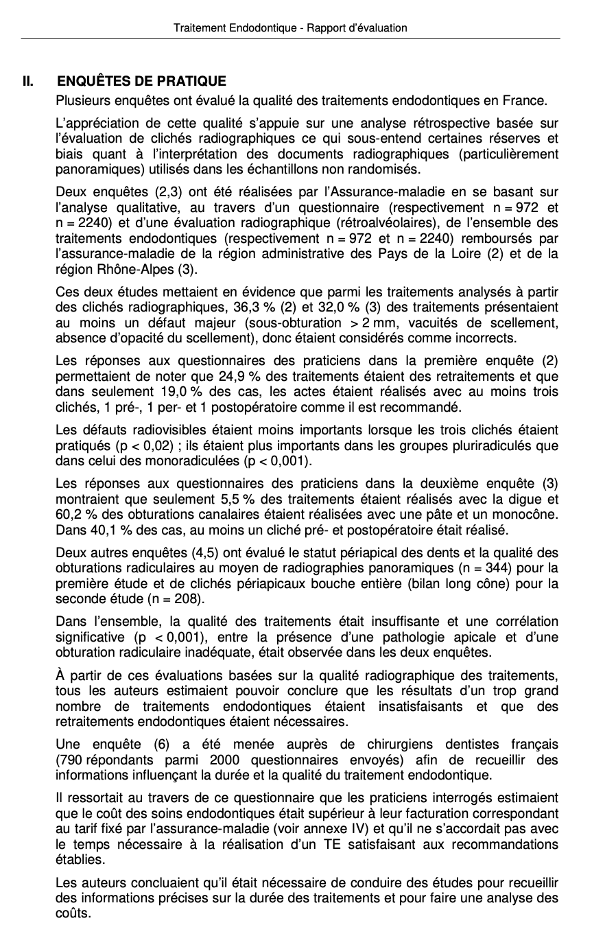 "Une enquête (6) a été menée auprès de chirurgiens dentistes français (790répondants parmi 2000 questionnaires envoyés) afin de recueillir des informations influençant la durée et la qualité du traitement endodontique.