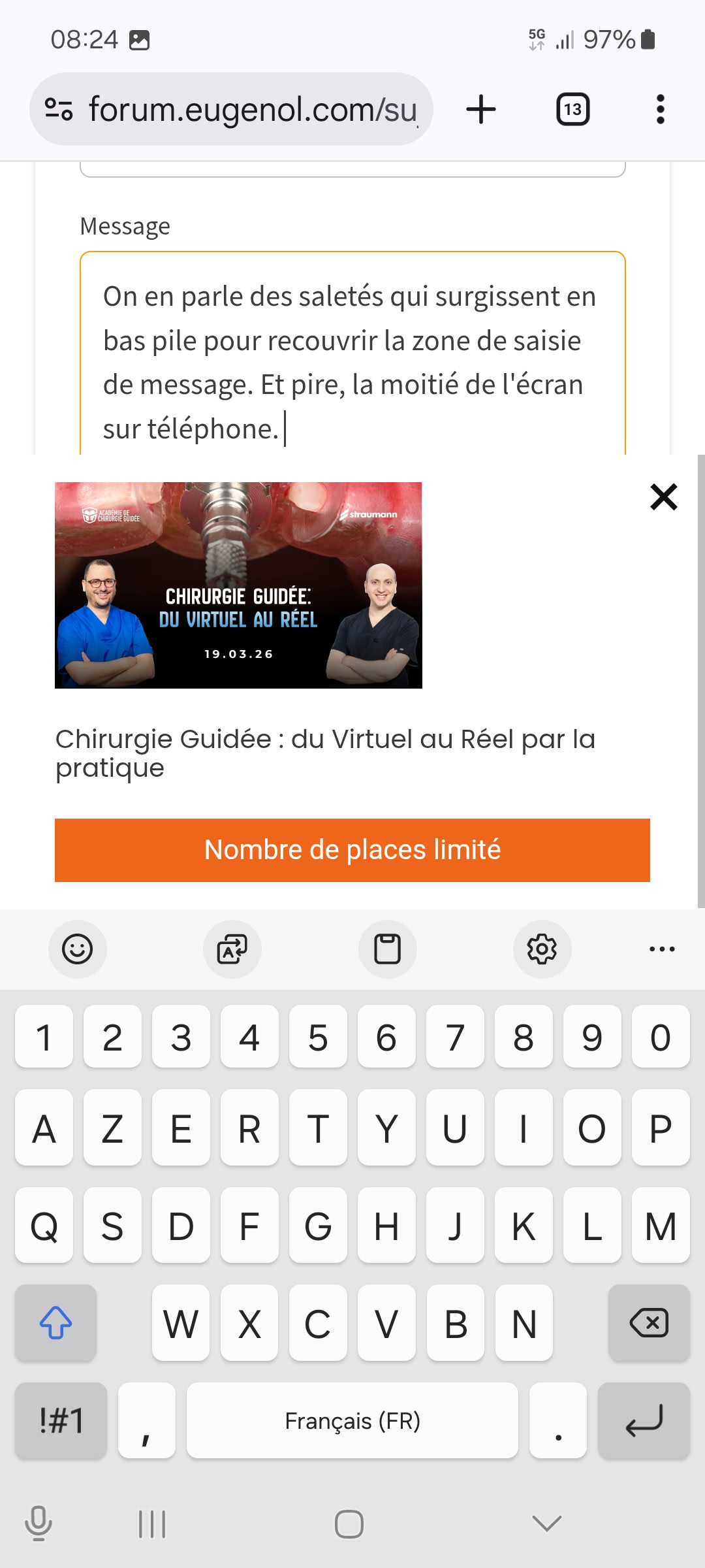 On en parle des saletés qui surgissent en bas pile pour recouvrir la zone de saisie de message. Et pire, la moitié de l'écran (résiduel quand je saisi, sinon c'est "juste" un tiers)sur téléphone.