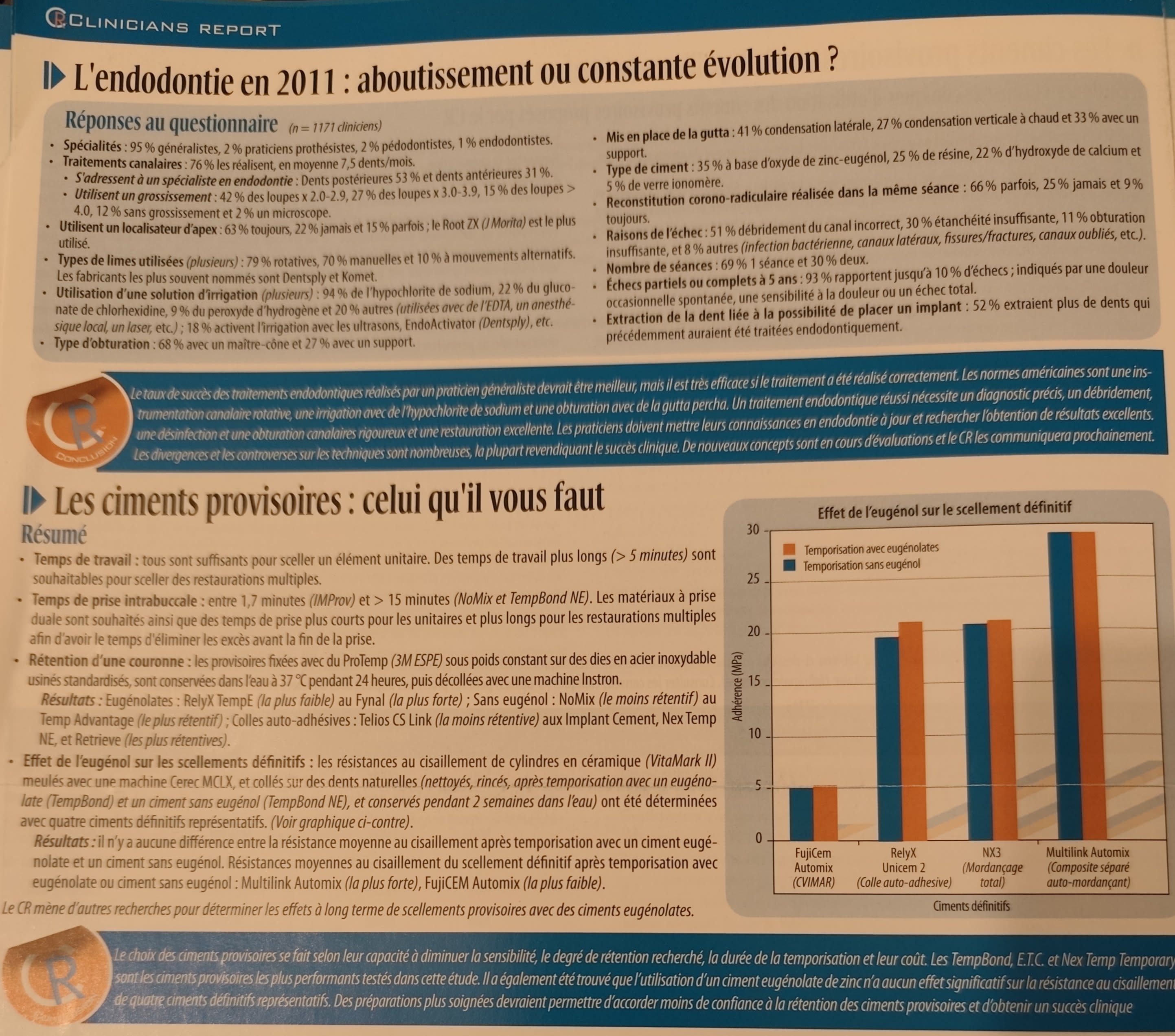 Oui, certaines études (et le "Clinicians Report" que tu montres) trouvent pas de différence entre provisoire avec eugénol vs sans eugénol-mais cela dépend surtout du système de collage/ciment définitif et du protocole de nettoyage, plus que de "l'eugénol" isolément.