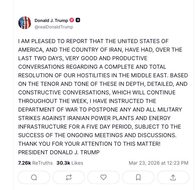 Il ne va rien régler du tout. L'ultimatum de ce soir est repoussé de 5 jours. C'est une grande victoire pour Trump. Les Iraniens sont vaincus et le régime est tombé. Il va pouvoir s'attaquer à Cuba.