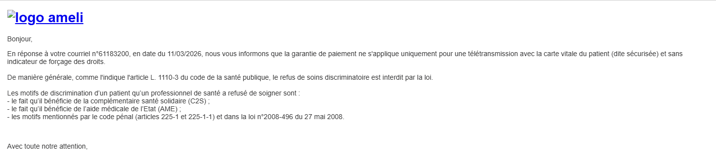 Que tu ais la carte ame ou l'attestation, c'est pareil. Tu dois utiliser le mode dégradé. Ce que je dis c'est que la carte ame (ou l'attestation papier) ne garantit pas le paiement car les droits de l'assuré ont pu changer entre temps. C'est la même chose avec l'attestation papier CSS ainsi que l'ADRI. Seule la carte vitale à jour garantit le paiement ( je parle du tp bien -sûr)