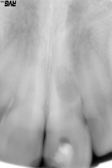 La dent semble perdue à ce stade de résorption. Tu parles de choc aseptique devenu septique. Je ne pense pas que ce soit le cas. L'image doit pls correcpondre à celle d'une résorption interne post-traumatique.