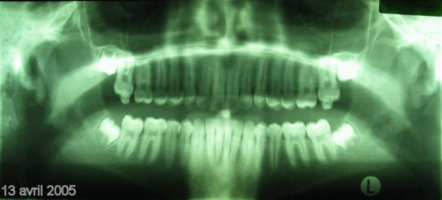 Bonjour, voici les clichés "panoramique" et "télé de profil" du 13 avril 2005 de Florent B. (voir les premiers posts pour comparer juillet 2001 et mars 2004 avec ce 13 avril 2005). J'espère que ces radios vous conviendront parfaitement pour les mesures? Aucun "trucage".