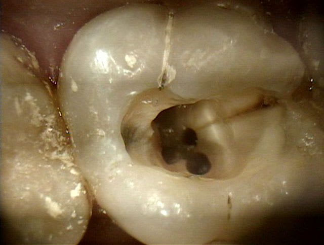 Le patient est revenu hier, la douleurs s'était calmée et j'ai dévitalisée de la dent.Mais en regardant bien, j'ai remarqué un trait de fissure mésial partant de la face occlusale et se dirigeant vers l'une des entrée canalaire mésiale.