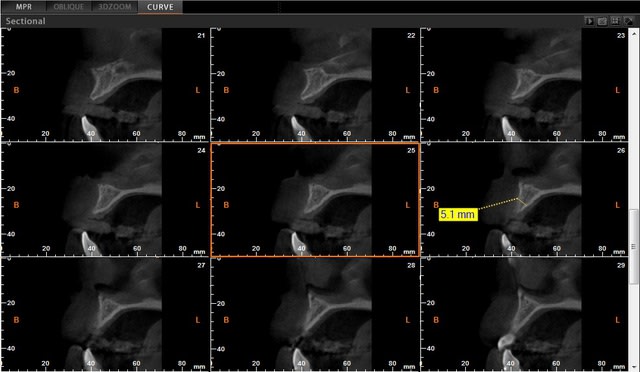 voici les coupes pré et post op. je précise que je fais pas un CBCT aprés chaque greffe. Ici c'est ma deuxieme, et je voulais voir ce que ça donne en post op puis à 5 mois....puisque la fonte des greffons est sujette à polémique bibliographique.....