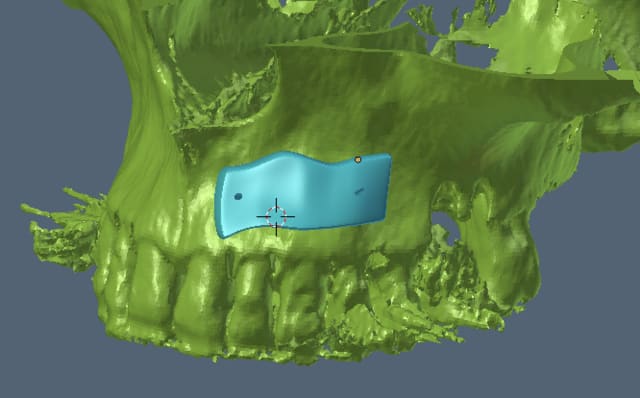 Au départ la 13 devait être gardée mais suite à un accident la racine s'est fracturée donc extraction et pose d'un implant. J'ai fait une ROG (granules biobank et membrane collagène) et arrondis l'angle distal du greffon.