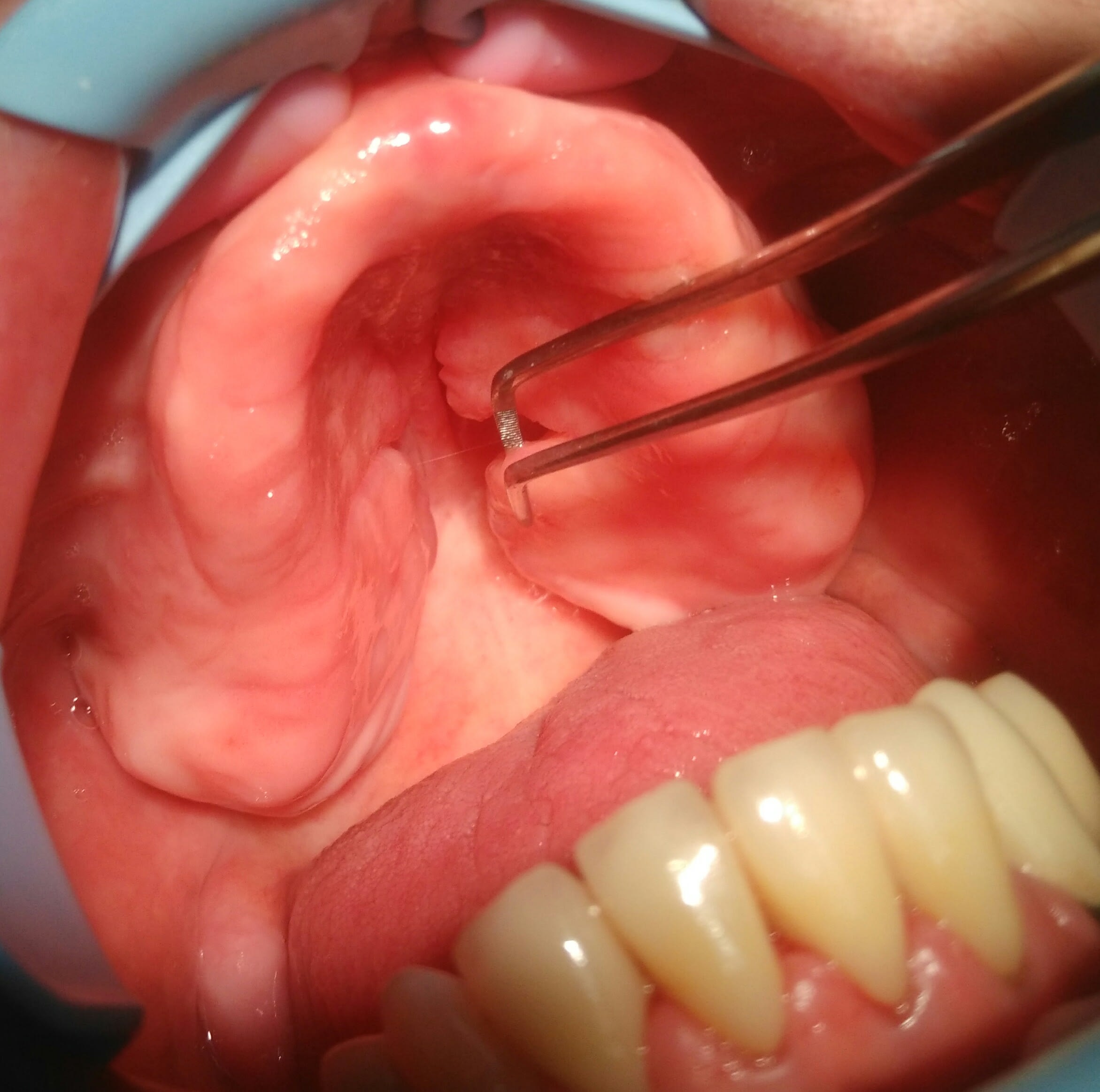 Sous la prothèse, hyperplasie gingivale bilatérale palatine.