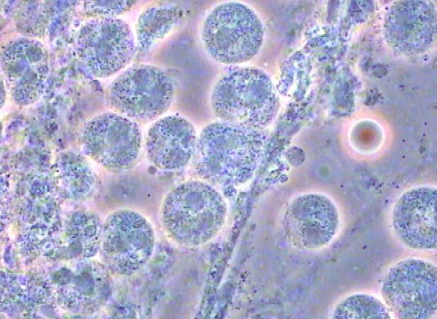 Sinon, encore plus petits, on voit parfois les granulations d'un PMN qui vient d'éclater se répandre partout en "vibrant" mais dans ce cas il y a des bestioles aggressives dans tous les sens.