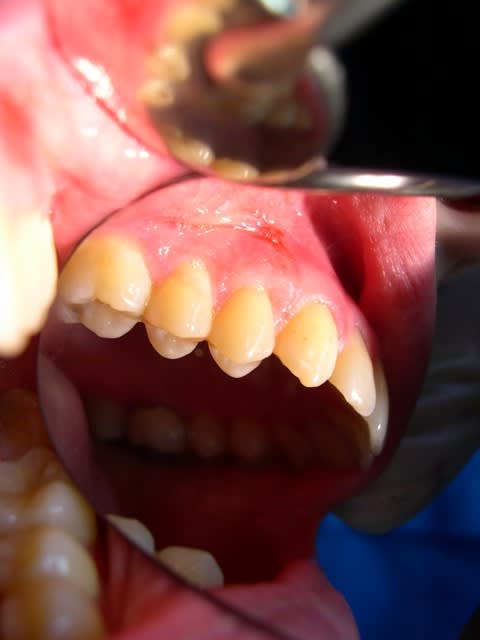 voilà un cas clinique où j'ai dû enlever un fil résorbable resté en place 2 mois, avec une jolie inflammation.