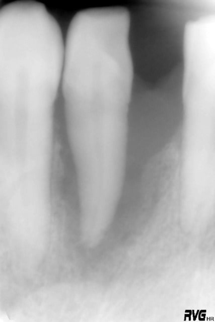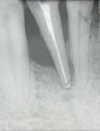 La cavité d'accès montre qu'une minéralisation rendait le traitement difficile.