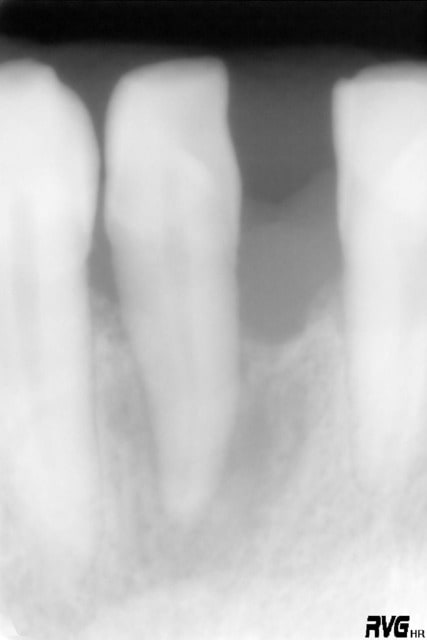on ne m' a meme pas demandé l' étiologie...domage...trauma occlusal lié à une ccm merdique posée un an avant par son ex dentiste....(passons sur l' endo sous la ccm....) bref, un cas de lésion très localisée, à l' étiologie connue qui se prétait bien à la contention+ttt local....