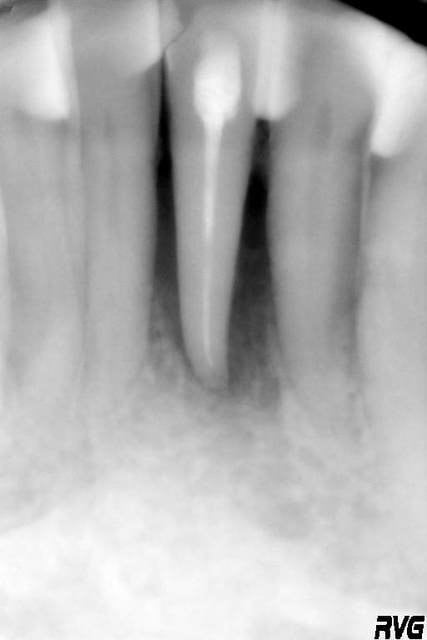on ne m' a meme pas demandé l' étiologie...domage...trauma occlusal lié à une ccm merdique posée un an avant par son ex dentiste....(passons sur l' endo sous la ccm....) bref, un cas de lésion très localisée, à l' étiologie connue qui se prétait bien à la contention+ttt local....