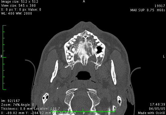 De retour de vacances, son praticien a finalement extrait cette dent et l'a adressé à un stomato pour une éventuelle implantation, mais à la vue du scan (et selon mon patient) ce dernier n'est pas chaud pour une greffe. (proximité du canal palatin)