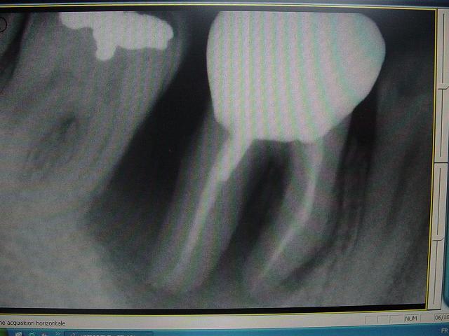 Bref, on a commencé les soins sur la 36 y'a "que" 15 jours : en premier lieu j'ai déposé la coiffe puis déposé l'amalgame puis déposé le screw post disrtal. Ensuite j'ai d'abord envisagé reprise endos puis coiffe sur 2 inlay core avec espace pour brossette puis je me suis apperçu que racine mésiale était fendue àla sénace d'aprés et donc dent perdue.