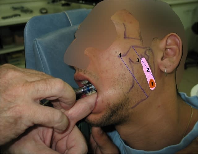 Alors, pour vous plaire, voici une photo de ce que j’ai fait hier en vue de réaliser une empreinte maxillaire pour construire le P.M.R.I.-P.O. : 2 grammes Dafalgan ½ heure avant l’anesthésie à l’échancrure sigmoïde = nerf masséter moteur + sensibilité profonde et qui émerge / s’engouffre entre les deux faisceaux du m. Ptérygoïdien Externe.