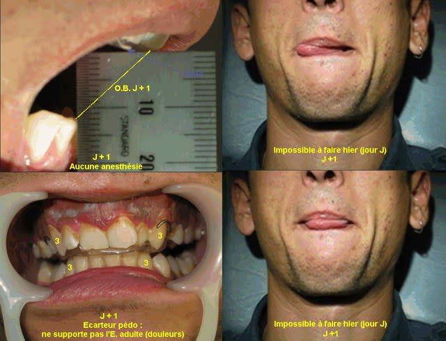 Quoi qu'il en soit, je n'ai pas encore rencontré de cas similaire et ne peux donc parler d'expérience. Néanmoins, c'est le genre de procédure que je ne mettrai pas en place dans ma pratique compte-tenu du risque. Il y a d'autres moyens pour lever un trismus.