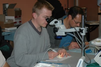 ceci dit, l'utilisation du microscope, contrairement à celle des loupes, nécessite un changement complet de méthode de travail, en particulier la nécessité d'avoir une assistante scotchée au fauteuil pendant le temps de l'intervention. l'idéal étant que l'opérateur ne lève pas les yeux des occulaires. les instruments doivent tomber sous la main avec une précision millimétrique. c'est pas évident à mettre en place, mais quand ça l'est c'est le grand bonheur.